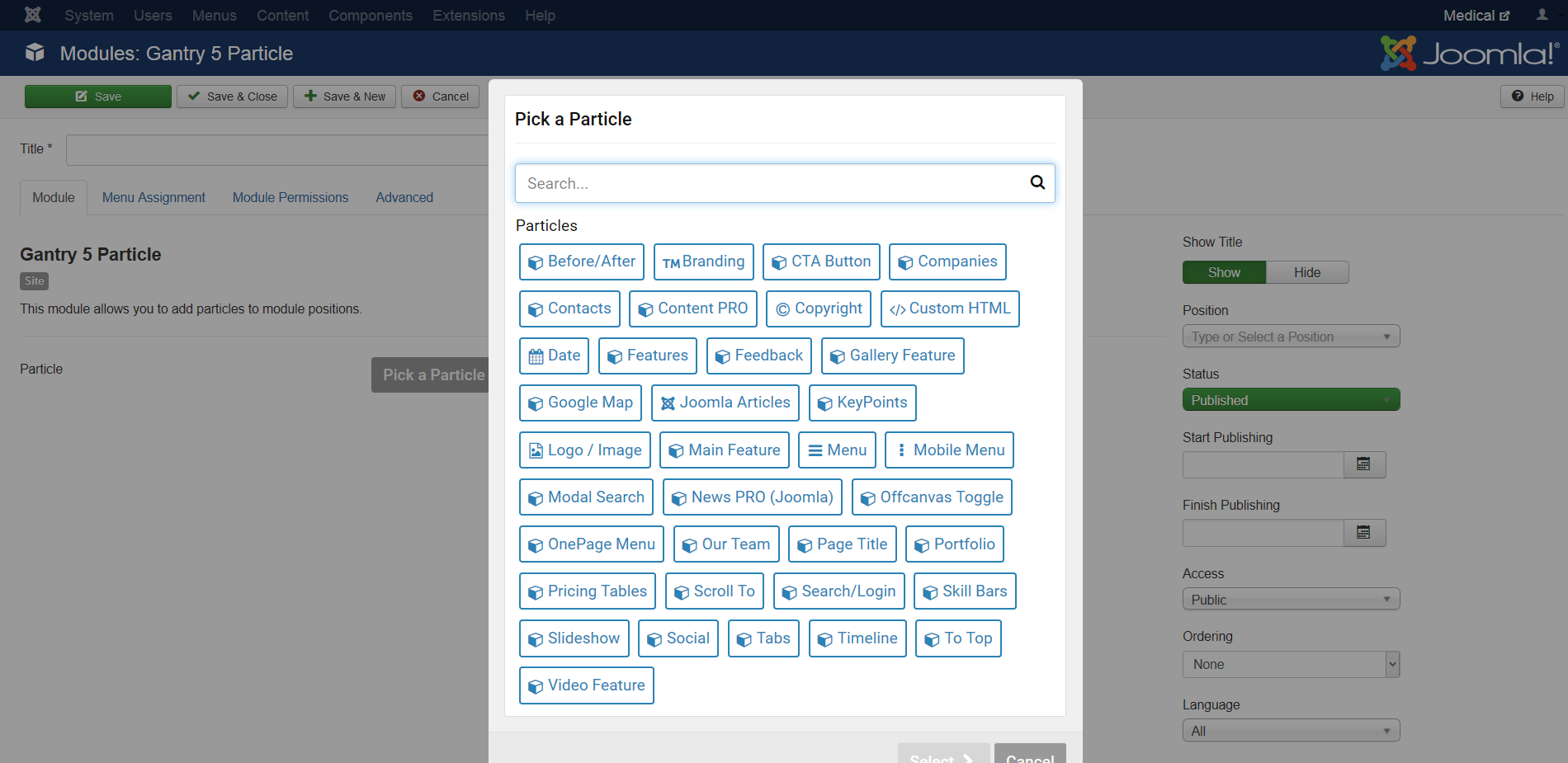 Gantry 5's new Particles system makes it easy to create, configure, and manage content blocks. Create new Particles in minutes, adjust their settings at multiple levels from global down to the individual block, and more!